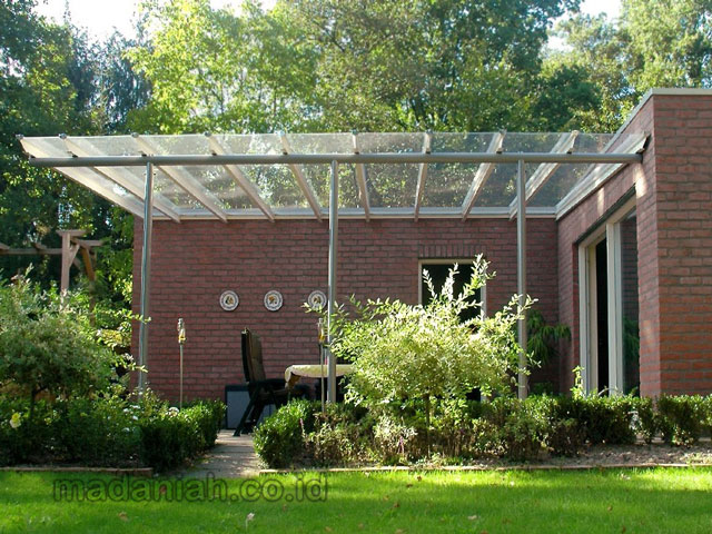 Kanopi minimalis teras rumah – Tidak ada salahnya bila kita memasang kanopi di rumah untuk memayungi bagian sisi rumah dari guyuran air hujan serta panas matahari. Kanopi semakin terkenal seiring perkembangan rumah rumah dengan desain minimalis, yang sebagian besar memang didesain tidak memiliki garasi didalam ruangan. Banyak kanopi yang didesain tidak hanya memiliki fungsi sebagai paying namun juga pelengkap rumah yang memiliki nilai estetika. Jika zaman dulu kanopi banyak menggunakan bahan dari plastik dan juaga bahan seng, saat ini kanopi menggunakan bahan baku yang semakin beragam. Selain kini banyak sekali desain yang begitu menarik, namun kualitas kanopi tetap perlu diperhatikan, mengingat terdapat beragam jenis kanopi yang sudah beredar dan tersedia di pasaran.