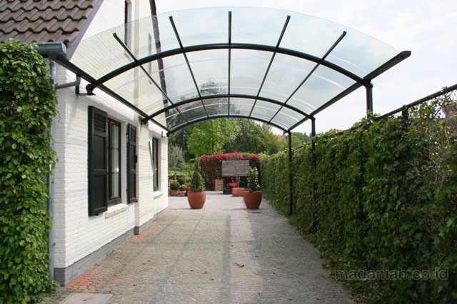 Bengkel las MADANIAH penyedia kanopi carport rumah minimalis dengan kualitas bahan terbaik dengan harga yang terjangkau. Kami menyediakan jasa pembuatan dan pemasangan kanopi rumah, atap baja ringan, pagar besi, pintu besi, pintu garasi, pintu gerbang, railing tangga, railing balkon, tangga besi, teralis jendela dengan berbagai model, baik minimalis, klasik maupun modern, dari berbagai macam bahan seperti besi tempa, besi stainless steel, besi nako dan masih banyak lagi. Warna cat, ukuran, model, dan karakter dapat di pesan sesuai selera dan keinginan pelanggan (make to order by appointment). Menyediakan produk aksesoris rumah, kantor, apartemen, atau fasilitas umum lainnya dengan bahan-bahan pilihan. Kami juga melayani service / perbaikan / perawatan.