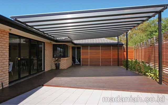 Harga kanopi garasi rumah Purworejo – Mungkin anda baru saja membeli sebuah mobil, dan mobil harus di parker di luar karena tidak memiliki garasi. Oleh sebab itu, kanopi carport atau garasi mobil sangat di perlukan untuk melindungi mobil dari panas teriknya sinar matahari dan juga terpaan air hujan. Kanopi merupakan solusi yang tepat. Kanopi garasi merupakan emper di luar ruangan yang difungsikan sebagai tempat memarkir kendaraan, lazimnya terbuat dari kayu maupun aluminium atau baja. Dengan desain yang hanya berupa frame dan atap membuat kanopi memberikan kesan terbuka. Atap kanopi bisa terbuat dari berbagai bahan seperti kaca, polikarbonat ataupun genteng metal. Pemasangan kanopi juga lebih ekonomis daripada membangun ruangan garasi.