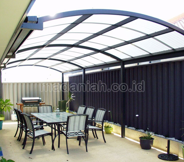 Bengkel las MADANIAH penyedia kanopi teras belakang rumah dengan kualitas bahan terbaik dengan harga yang terjangkau. Kami menyediakan jasa pembuatan dan pemasangan kanopi rumah, atap baja ringan, pagar besi, pintu besi, pintu garasi, pintu gerbang, railing tangga, railing balkon, tangga besi, teralis jendela dengan berbagai model, baik minimalis, klasik maupun modern, dari berbagai macam bahan seperti besi tempa, besi stainless steel, besi nako dan masih banyak lagi. Warna cat, ukuran, model, dan karakter dapat di pesan sesuai selera dan keinginan pelanggan (make to order by appointment). Menyediakan produk aksesoris rumah, kantor, apartemen, atau fasilitas umum lainnya dengan bahan-bahan pilihan. Kami juga melayani service / perbaikan / perawatan.