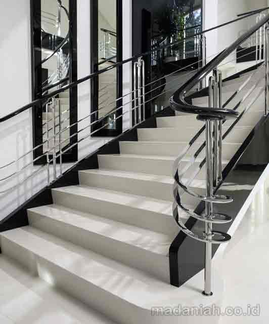 Bengkel las MADANIAH penyedia railing tangga stainless steel minimalis dengan kualitas bahan terbaik dengan harga yang terjangkau. Kami menyediakan jasa pembuatan dan pemasangan kanopi rumah, atap baja ringan, pagar besi, pintu besi, pintu garasi, pintu gerbang, railing tangga, railing balkon, tangga besi, teralis jendela dengan berbagai model, baik minimalis, klasik maupun modern, dari berbagai macam bahan seperti besi tempa, besi stainless steel, besi nako dan masih banyak lagi. Warna cat, ukuran, model, dan karakter dapat di pesan sesuai selera dan keinginan pelanggan (make to order by appointment). Menyediakan produk aksesoris rumah, kantor, apartemen, atau fasilitas umum lainnya dengan bahan-bahan pilihan. Kami juga melayani service / perbaikan / perawatan.