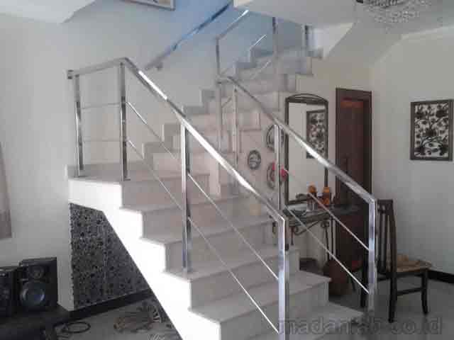 Bengkel las MADANIAH penyedia railing tangga stainless steel dengan kualitas bahan terbaik dengan harga yang terjangkau. Kami menyediakan jasa pembuatan dan pemasangan kanopi rumah, atap baja ringan, pagar besi, pintu besi, pintu garasi, pintu gerbang, railing tangga, railing balkon, tangga besi, teralis jendela dengan berbagai model, baik minimalis, klasik maupun modern, dari berbagai macam bahan seperti besi tempa, besi stainless steel, besi nako dan masih banyak lagi. Warna cat, ukuran, model, dan karakter dapat di pesan sesuai selera dan keinginan pelanggan (make to order by appointment). Menyediakan produk aksesoris rumah, kantor, apartemen, atau fasilitas umum lainnya dengan bahan-bahan pilihan. Kami juga melayani service / perbaikan / perawatan.