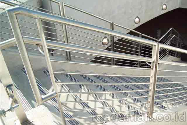 Harga pasang railing tangga stainless steel minimalis Klaten – Untuk sebagian orang yang memiliki hunian bertingkat mungkin akan dibingungkan dengan pemilihan desain tangga, balkon maupun void. Belum lagi memilih desain dan bahan railing yang cocok dan pas untuk diaplikasikan dan disesuaikan dengan konsep hunian kita.Untuk pembuatan railing tangga ada banyak bahan yang dapat digunakan, seperti bahan logam, kayu, kaca dan juga beton. namun semuanya juga harus disesuaikan dengan bentuk ruangan yang akan kita gunakan untuk meletakkan tangga.