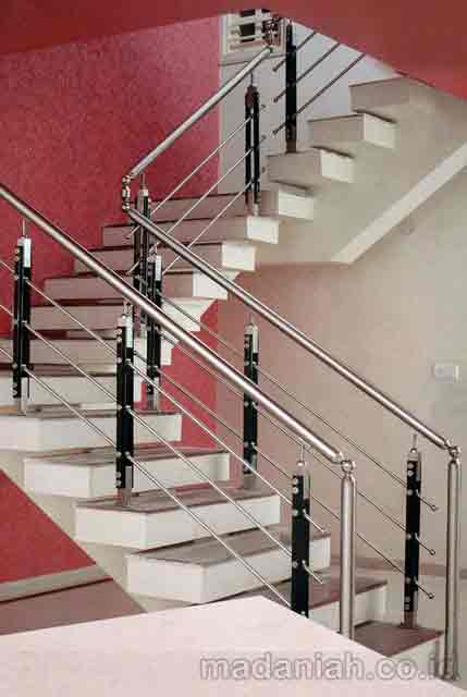 Dari semua bahan railing, logam stainless steel memiliki karakter lebih bagus, kuat, unik dan juga memunculkan kesan elegan. Disamping mampu menahan korosi, stainless steel juga terlihat mewah. Railing yang menggunakan bahan dari stainless ini biasanya memiliki desain minimalis. Untuk masalah harga railing tangga stainless steel minimalis memang terbilang cukup mahal, tetapi sebanding dengan perawatannya yang cukup mudah sehingga dapat menekan pengeluaran untuk jangka panjang.