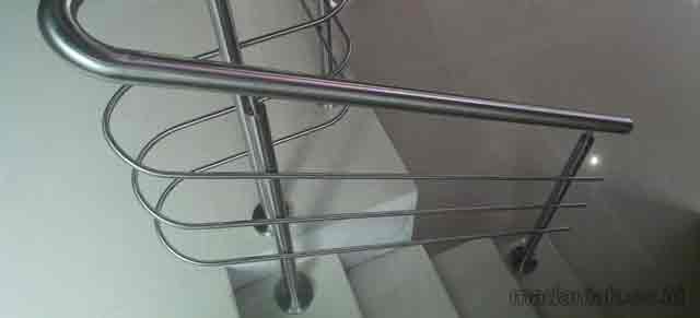 Dari semua bahan railing, logam stainless steel memiliki karakter lebih bagus, kuat, unik dan juga memunculkan kesan elegan. Disamping mampu menahan korosi, stainless steel juga terlihat mewah. Railing yang menggunakan bahan dari stainless ini biasanya memiliki desain minimalis. Untuk masalah harga railing tangga stainless steel minimalis memang terbilang cukup mahal, tetapi sebanding dengan perawatannya yang cukup mudah sehingga dapat menekan pengeluaran untuk jangka panjang.