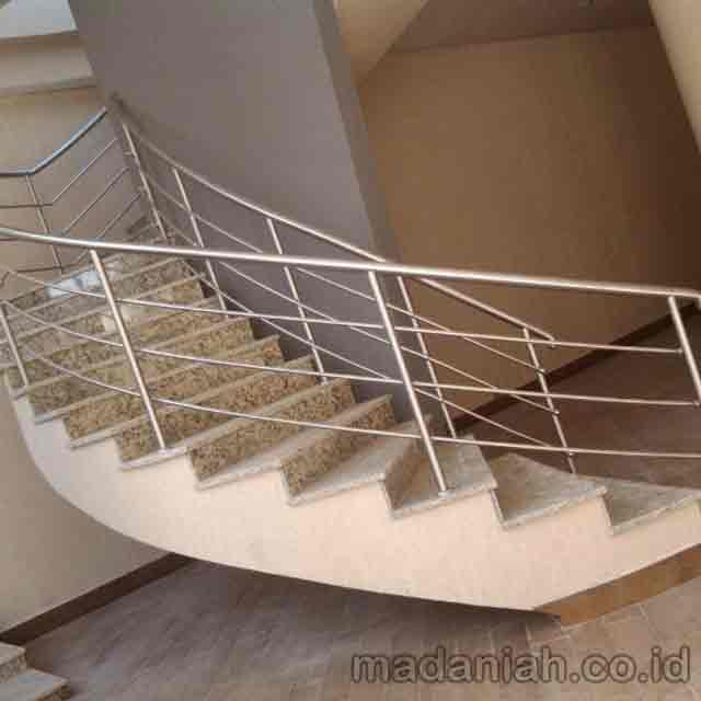 Bengkel las MADANIAH penyedia railing tangga stainless steel minimalis dengan kualitas bahan terbaik dengan harga yang terjangkau. Kami menyediakan jasa pembuatan dan pemasangan kanopi rumah, atap baja ringan, pagar besi, pintu besi, pintu garasi, pintu gerbang, railing tangga, railing balkon, tangga besi, teralis jendela dengan berbagai model, baik minimalis, klasik maupun modern, dari berbagai macam bahan seperti besi tempa, besi stainless steel, besi nako dan masih banyak lagi. Warna cat, ukuran, model, dan karakter dapat di pesan sesuai selera dan keinginan pelanggan (make to order by appointment). Menyediakan produk aksesoris rumah, kantor, apartemen, atau fasilitas umum lainnya dengan bahan-bahan pilihan. Kami juga melayani service / perbaikan / perawatan.