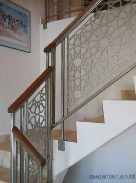 Bengkel las MADANIAH penyedia railing tangga besi pegangan kayu dengan kualitas bahan terbaik dengan harga yang terjangkau. Kami menyediakan jasa pembuatan dan pemasangan kanopi rumah, atap baja ringan, pagar besi, pintu besi, pintu garasi, pintu gerbang, railing tangga, railing balkon, tangga besi, teralis jendela dengan berbagai model, baik minimalis, klasik maupun modern, dari berbagai macam bahan seperti besi tempa, besi stainless steel, besi nako dan masih banyak lagi. Warna cat, ukuran, model, dan karakter dapat di pesan sesuai selera dan keinginan pelanggan (make to order by appointment). Menyediakan produk aksesoris rumah, kantor, apartemen, atau fasilitas umum lainnya dengan bahan-bahan pilihan. Kami juga melayani service / perbaikan / perawatan.