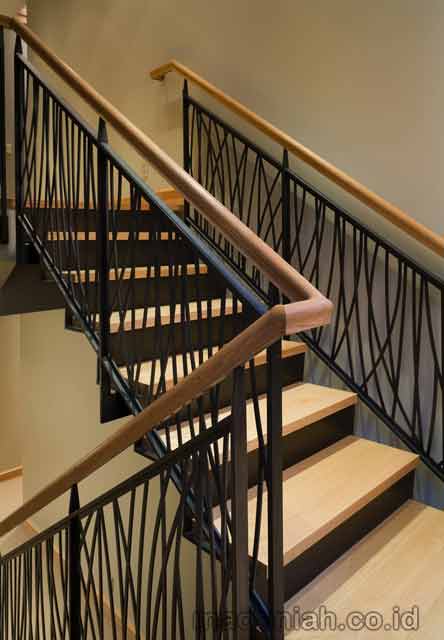 Karena tangga didesain simple, maka tidak akan cocok jika kita menggunakan railing yang memiliki banyak detail ukiran seperti hunian klasik. Railing tangga besi yang simple dengan motif garis vertikal maupun horizontal serta kombinasi kayu pada pegangannya bisa menjadi solusi untuk kita aplikasikan pada huninan minimalis. Railing tangga besi dengan pegangan kayu dapat kita beri warna sesuai dengan warna keseluruhan hunian, sehingga akan terlihat lebih cantik dan modern.