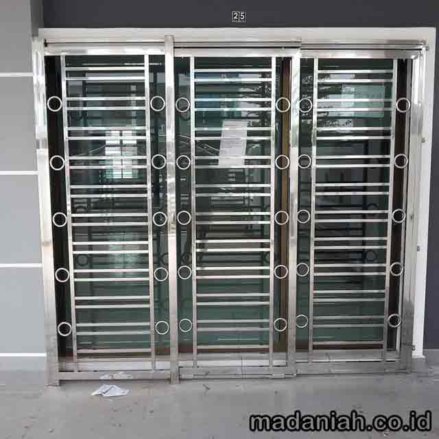 Bengkel las MADANIAH penyedia teralis stainless steel dengan kualitas bahan terbaik dengan harga yang terjangkau. Kami menyediakan jasa pembuatan dan pemasangan kanopi rumah, atap baja ringan, pagar besi, pintu besi, pintu garasi, pintu gerbang, railing tangga, railing balkon, tangga besi, teralis jendela dengan berbagai model, baik minimalis, klasik maupun modern, dari berbagai macam bahan seperti besi tempa, besi stainless steel, besi nako dan masih banyak lagi. Warna cat, ukuran, model, dan karakter dapat di pesan sesuai selera dan keinginan pelanggan (make to order by appointment). Menyediakan produk aksesoris rumah, kantor, apartemen, atau fasilitas umum lainnya dengan bahan-bahan pilihan. Kami juga melayani service / perbaikan / perawatan.