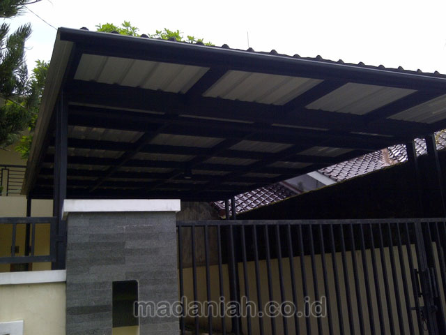 Bengkel las MADANIAH penyedia kanopi baja ringan galvalum dengan kualitas bahan terbaik dengan harga yang terjangkau. Kami menyediakan jasa pembuatan dan pemasangan kanopi rumah, atap baja ringan, pagar besi, pintu besi, pintu garasi, pintu gerbang, railing tangga, railing balkon, tangga besi, teralis jendela dengan berbagai model, baik minimalis, klasik maupun modern, dari berbagai macam bahan seperti besi tempa, besi stainless steel, besi nako dan masih banyak lagi. Warna cat, ukuran, model, dan karakter dapat di pesan sesuai selera dan keinginan pelanggan (make to order by appointment). Menyediakan produk aksesoris rumah, kantor, apartemen, atau fasilitas umum lainnya dengan bahan-bahan pilihan. Kami juga melayani service / perbaikan / perawatan.