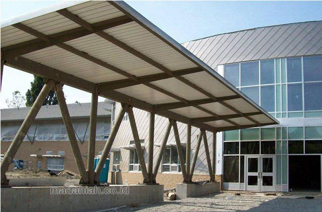 Kanopi baja ringan galvalum di Purworejo – Dahulu kanopi berfungsi untuk melindungi benda-benda berharga yang berada di bagian depan rumah dari paparan panas sinar matahari maupun terpaan air hujan, seperti kendaraan dan juga furniture. Namun dewasa ini, tidak hanya berfungsi sebagai pelindung, kanopi juga di fungsikan untuk memenuhi kebutuhan estetika memperindah dan mempercantik exterior rumah. Oleh sebab itu, pemilihan kerangka kanopi harus dilakukan dengan teliti dan juga hati-hati. Banyak kerangka kanopi yang biasa kita temui seperti dari bahan kayu, bahan besi dan juga bahan baja ringan galvalum, dimana masing-masing memiliki kelebihan serta kekurangan. Rangka kanopi dari bahan kayu memiliki kelebihan dari segi nilai estetika, namun sifatnya yang mudah lapuk bila sering terkena perubahan cuaca membuat kayu tidak lagi dijadikan pilihan utama. Belakangan ini, model kerangka kanopi baja ringan galvalum mulai menjadi trend, menggeser model kanopi dengan kerangka besi. Model kanopi baja ringan galvalum ini bila dibandingkan dengan model kanopi kayu dan juga besi memiliki beberapa kelebihan yang patut untuk diperhitungkan seperti sifat baja ringan galvalum yang tahan karat dan juga harganya yang relatif murah.