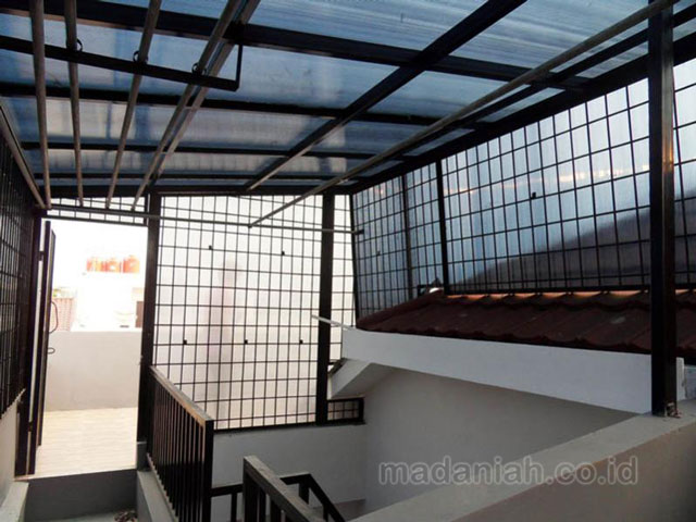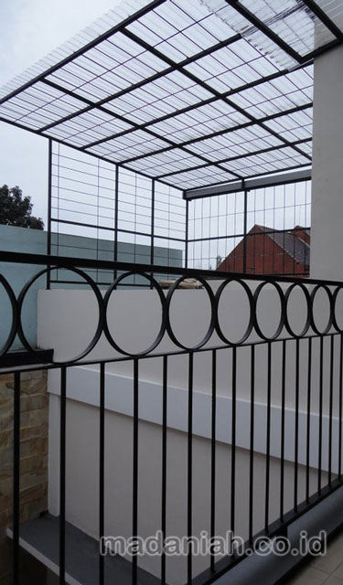 Bengkel las MADANIAH penyedia kanopi ruang jemuran baju dengan kualitas bahan terbaik dengan harga yang terjangkau. Kami menyediakan jasa pembuatan dan pemasangan kanopi rumah, atap baja ringan, pagar besi, pintu besi, pintu garasi, pintu gerbang, railing tangga, railing balkon, tangga besi, teralis jendela dengan berbagai model, baik minimalis, klasik maupun modern, dari berbagai macam bahan seperti besi tempa, besi stainless steel, besi nako dan masih banyak lagi. Warna cat, ukuran, model, dan karakter dapat di pesan sesuai selera dan keinginan pelanggan (make to order by appointment). Menyediakan produk aksesoris rumah, kantor, apartemen, atau fasilitas umum lainnya dengan bahan-bahan pilihan. Kami juga melayani service / perbaikan / perawatan.