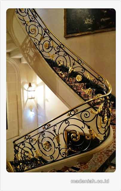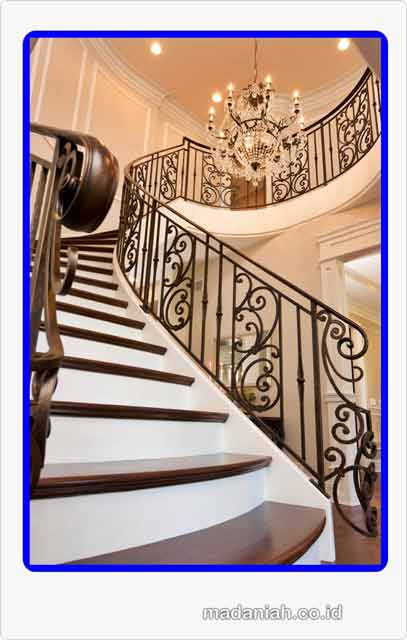 Railing tangga lengkung – Railing tangga atau pegangan tangga merupakan komponen yang sangat penting dalam membangun sebuah tangga, lantaran railing berpengaruh pada faktor keamanan dan kenyamanan dalam sebuah desain tangga. Saat kita mendesain sebuah railing jangan mengesampingkan rasa aman yang akan ditimbulkan, kita juga harus memperhatikan kemudahan pemeliharaan, serta kesesuaiannya dengan interior dan gaya arsitektur pada hunian kita secara keseluruhan. Railing akan terasa nyaman jika didesain sesuai dengan kebutuhan, selera, serta aktivitas. Dewasa ini, railing memiliki berbagai pilihan material yang dapat kita terapkan untuk menambah cantik tampilan tangga. Misalnya bahan logam, aluminium, kayu, stainless, kaca, beton atau besi
